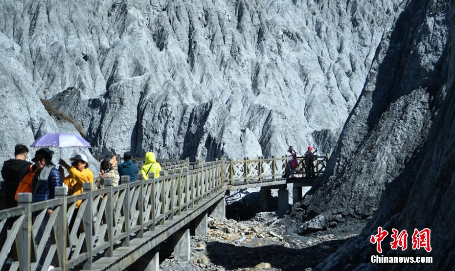 游人通過棧道進入“土石林”深處。劉忠俊 攝