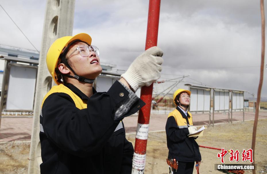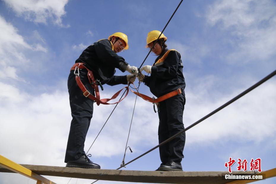 4月13日,青海省海北藏族自治州剛察縣,青藏鐵路公司西寧供電段哈爾蓋工區(qū),羅露露(左)手舉9米多長的地線桿向接觸網(wǎng)上掛地線。中新社記者 馬銘言 攝