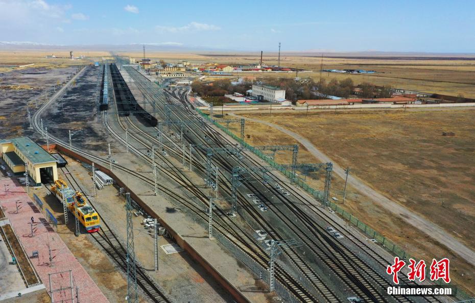 4月13日,青海省海北藏族自治州剛察縣,航拍青藏鐵路公司西寧供電段哈爾蓋工區(qū)負責維護的部分鐵路。中新社記者 馬銘言 攝
