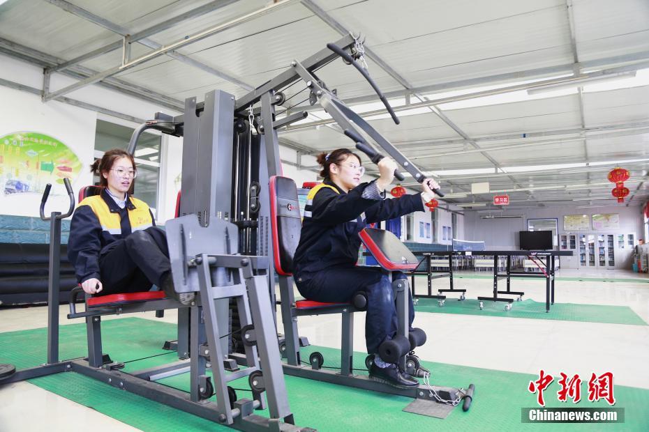 4月13日,青海省海北藏族自治州剛察縣,青藏鐵路公司西寧供電段哈爾蓋工區(qū),郭勝強(左)與羅露露一起健身鍛煉。中新社記者 馬銘言 攝