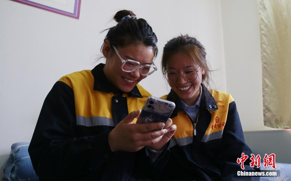 4月13日,青海省海北藏族自治州剛察縣,青藏鐵路公司西寧供電段哈爾蓋工區(qū)宿舍內,羅露露(左)與郭勝強在休息時間分享手機中的有趣內容。中新社記者 馬銘言 攝