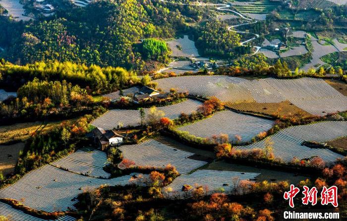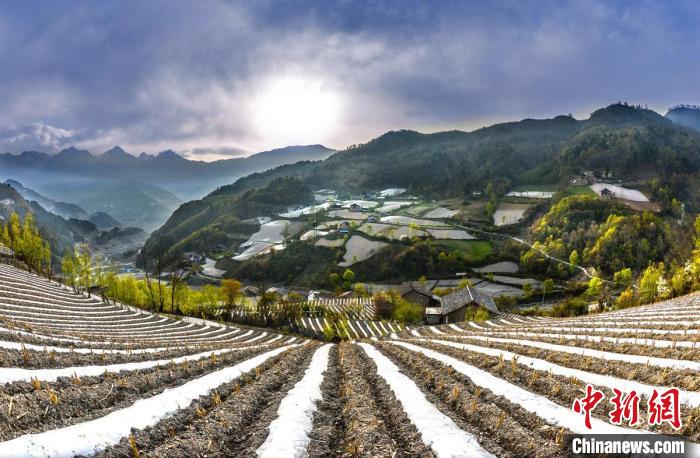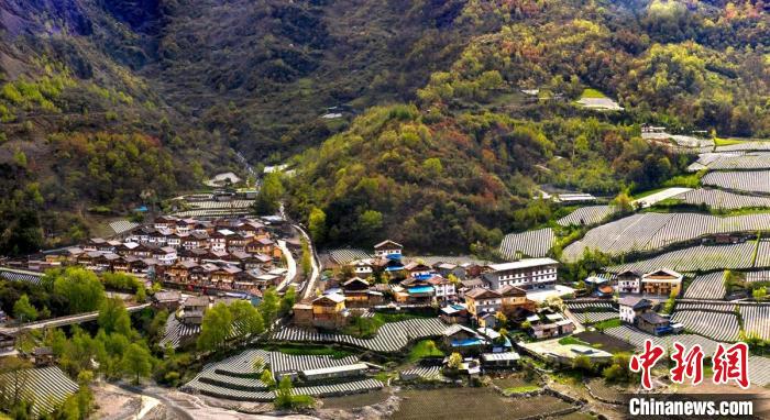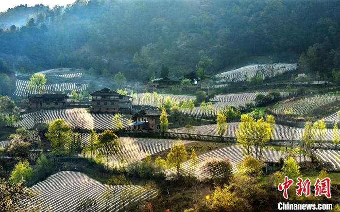4月的四川雅安市寶興縣磽磧藏族鄉,山坡上整齊有序的地膜,錯落有致鋪在藏寨林間,構成了一幅田園山水與天人合一的自然畫卷。