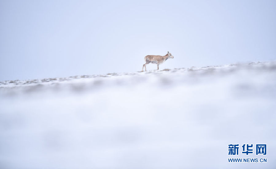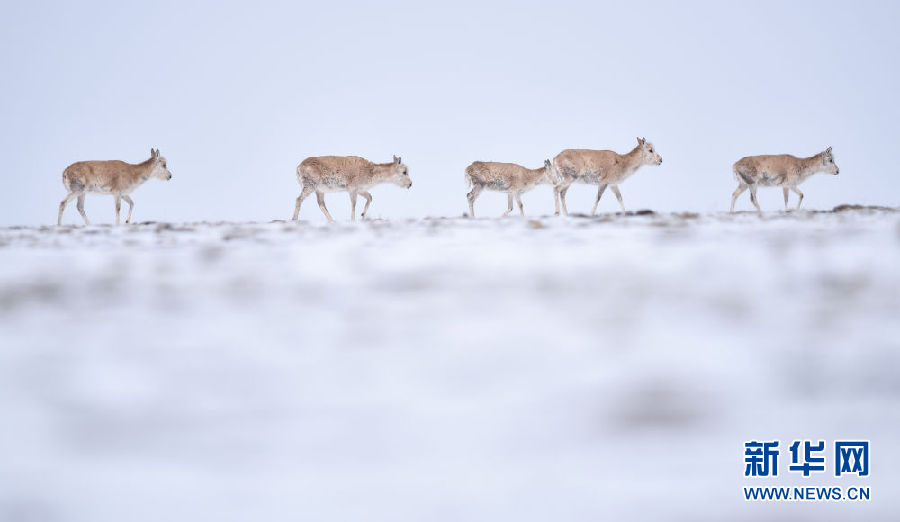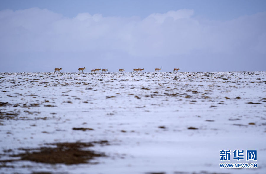 近日,可可西里迎來降雪,大量藏羚羊匯聚在可可西里五道梁地區,踏上遷徙之路。