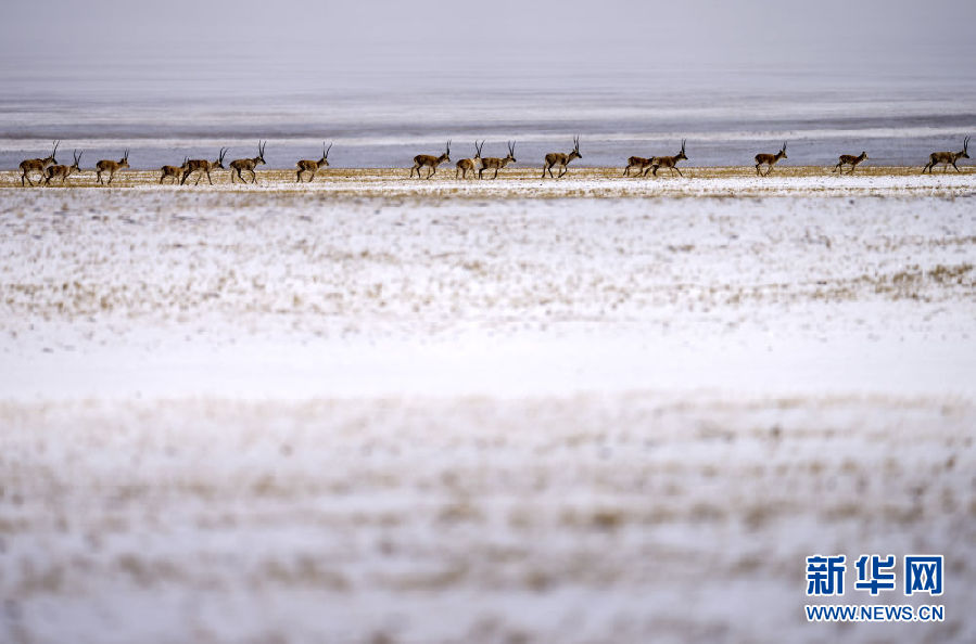 4月20日,一群藏羚羊向卓乃湖方向行進。新華社記者 費茂華 攝