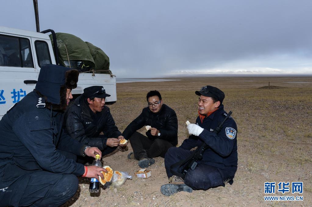 2014年12月26日,袁廣明(右二)和隊友進入可可西里巡山吃飯。新華社記者 吳剛 攝