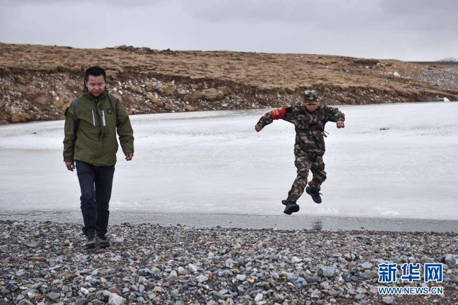 4月23日,祁連山國家公園沙龍灘管護站生態管護員羅藏次成(右)在巡護途中跳過水面。新華社記者 吳剛 攝