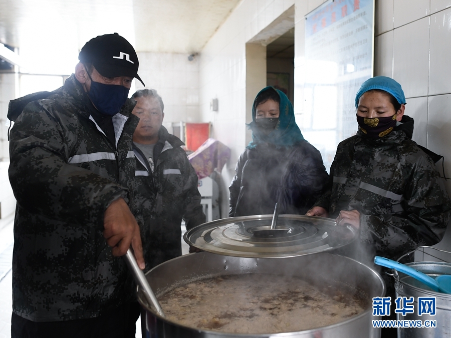 5月22日,在瑪多縣黃河鄉寄宿制學校救災安置點,老師們在給學生制作肉粥。新華社記者 張龍 攝