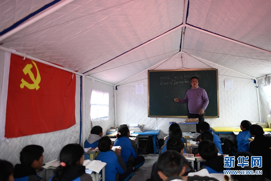 灰白色的天幕下,湛藍色的救災帳篷顯得格外顯眼。學校教師拉毛措告訴記者:地震發生后,老師們組織186名學生在5分鐘內全部疏散到操場,隨后轉移到搭建好的救災帳篷內。