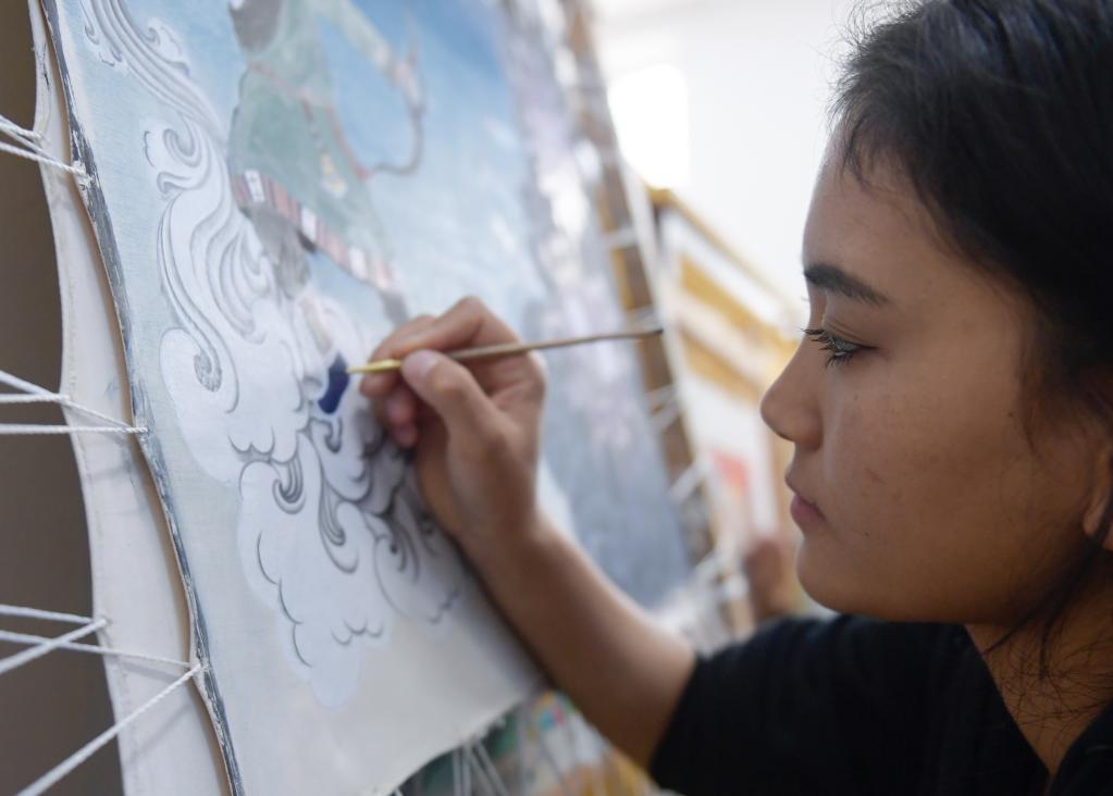 6月17日,在青海民族大學藝術學院,工藝美術(唐卡)專業學生在繪制唐卡。新華社記者 張龍 攝