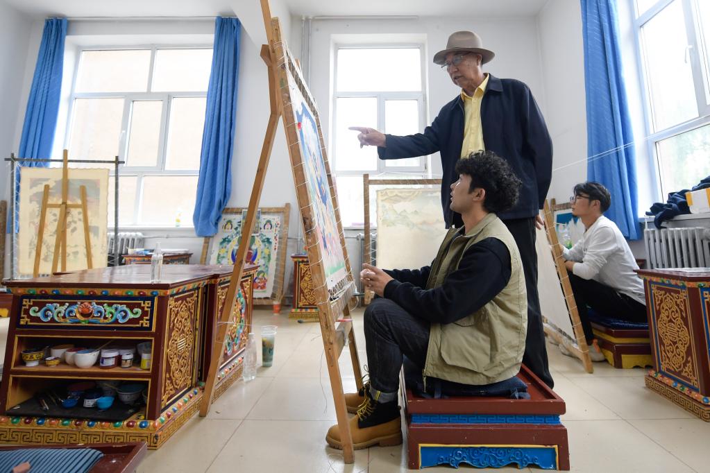 6月17日,在青海民族大學藝術學院,老師夏吾才讓(中)在指導工藝美術(唐卡)專業學生繪制唐卡。新華社記者 張龍 攝