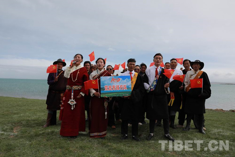 中國西藏網訊 6月30日,位于黃河源頭的青海省玉樹藏族自治州曲麻萊縣麻多鄉扎加村3個牧民小組的120余名牧民來到扎陵湖畔,慶祝中國共產黨成立100周年,參加紅歌比賽。