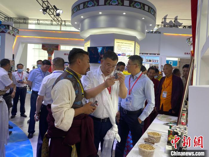 圖為在第22屆青洽會上,拉東才索南帶來了黑青稞酒、面等產品。受訪者供圖