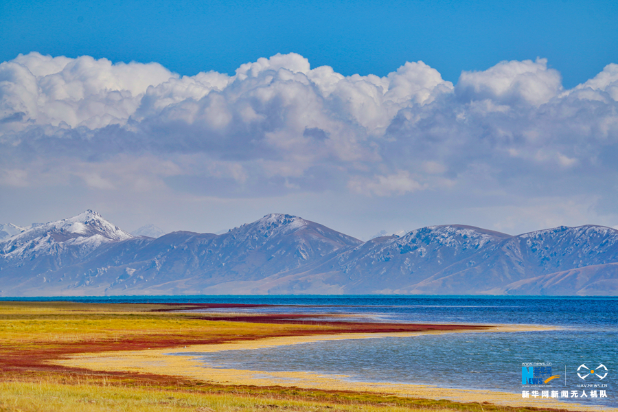 冬格措納湖位于青海省果洛藏族自治州瑪多縣境內,海拔4000米以上。秋日的冬格措納湖,湖水湛藍、天空遼闊,湖畔的草地紅綠黃交融,一幅大自然的美麗畫卷在這里展開。新華網 宋忠勇 攝