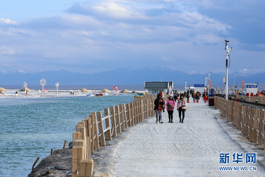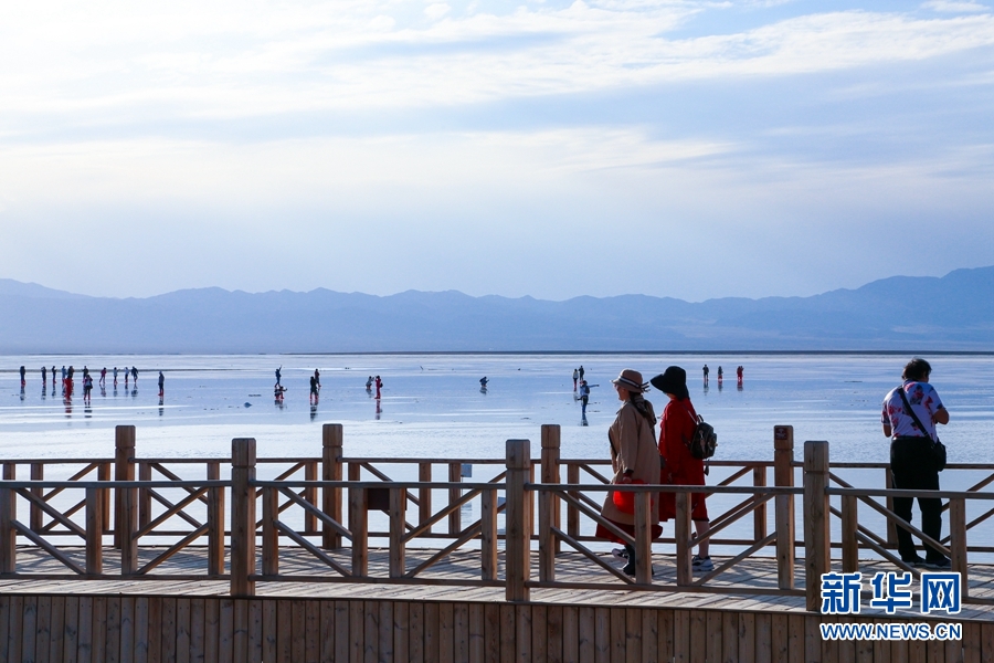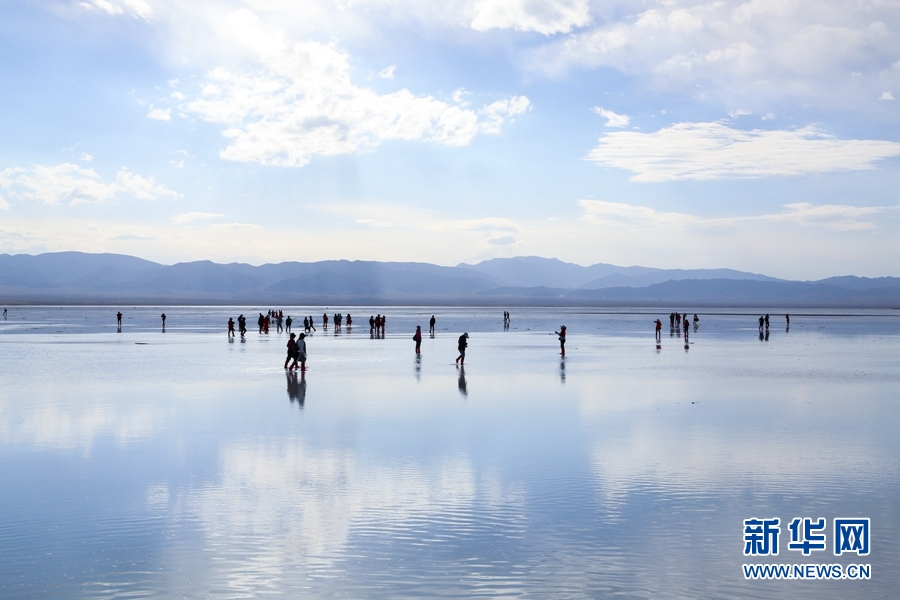 游客在茶卡鹽湖“天空之鏡”景區漫步。新華網 卡婭梅朵 攝