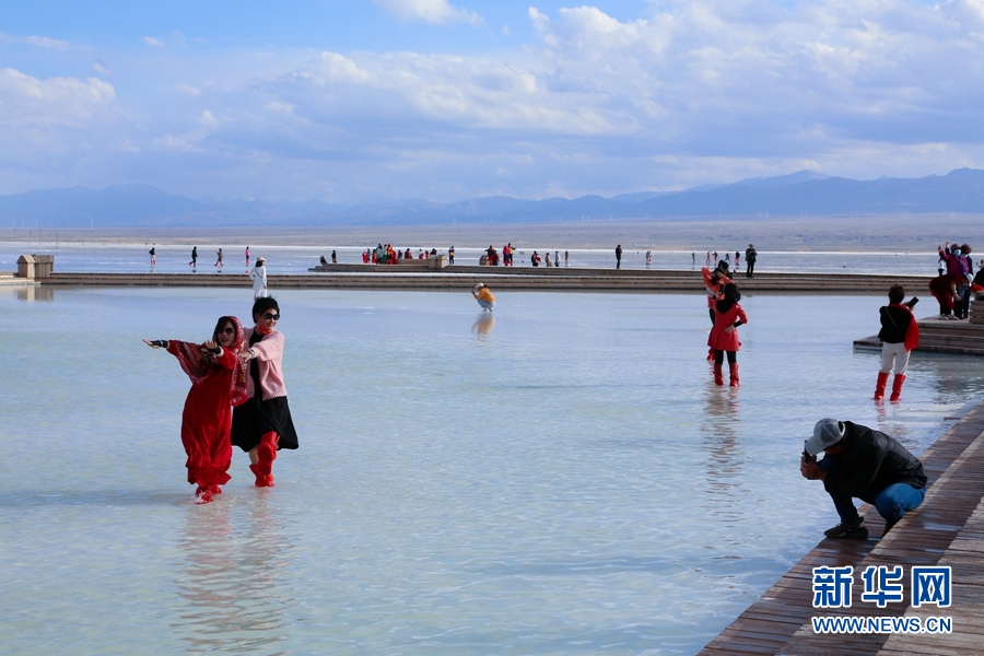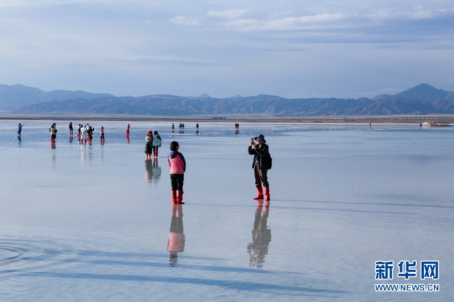 游客在茶卡鹽湖“天空之鏡”景區游玩。新華網 卡婭梅朵 攝