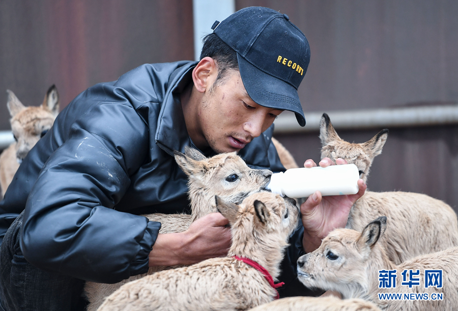可可西里國家級自然保護區(qū)卓乃湖保護站的工作人員才文多杰在給藏羚羊幼仔喂奶(2020年7月7日攝)。新華社記者 薛玉斌 攝