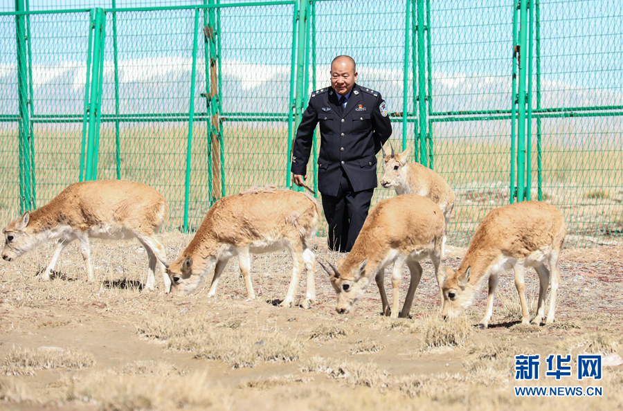 在可可西里國家級自然保護區(qū)索南達杰保護站,站長趙新錄與藏羚羊在一起(9月28日攝)。新華社記者 李占軼 攝