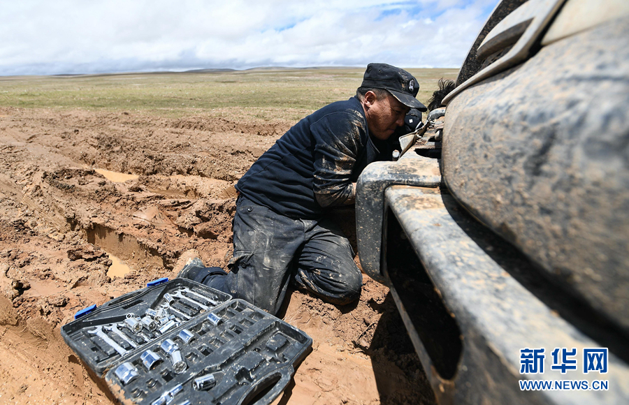 可可西里國家級自然保護區(qū)卓乃湖保護站站長秋培扎西在可可西里地區(qū)修理車輛(2020年7月6日攝)。新華社記者 薛玉斌 攝