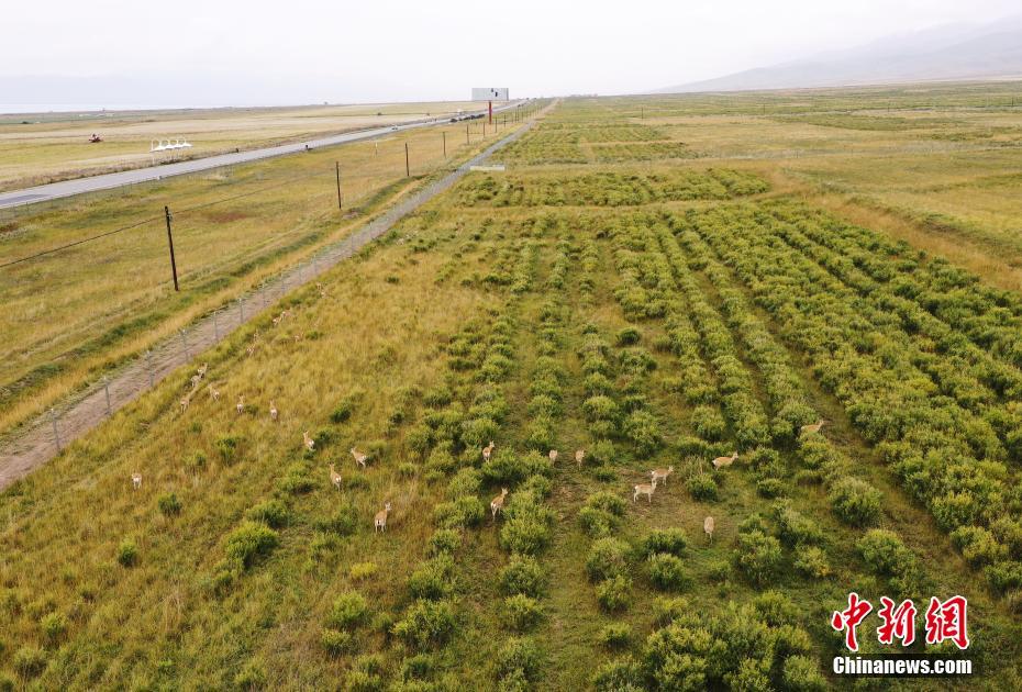 9月27日,在青海省海南藏族自治州共和縣青海湖國家級自然保護區南岸保護站,普氏原羚在草場內進食。 中新社記者 馬銘言 攝