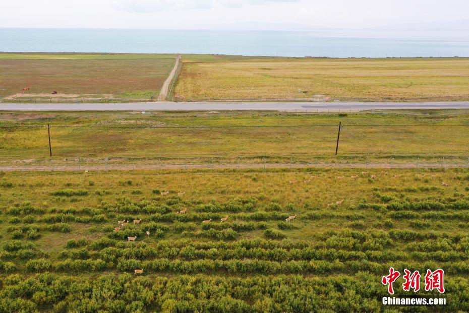 9月27日,在青海省海南藏族自治州共和縣青海湖國家級自然保護區南岸保護站,普氏原羚在草場內進食。(無人機照片) 中新社記者 馬銘言 攝