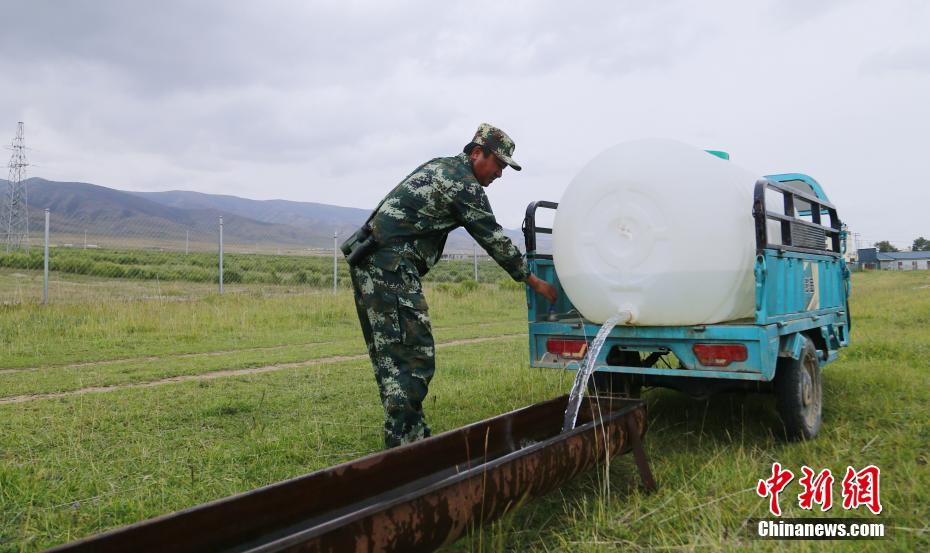 9月27日,在青海省海南藏族自治州共和縣青海湖國家級自然保護區南岸保護站內,管護員往普氏原羚的水槽內添水。中新社記者 馬銘言 攝
