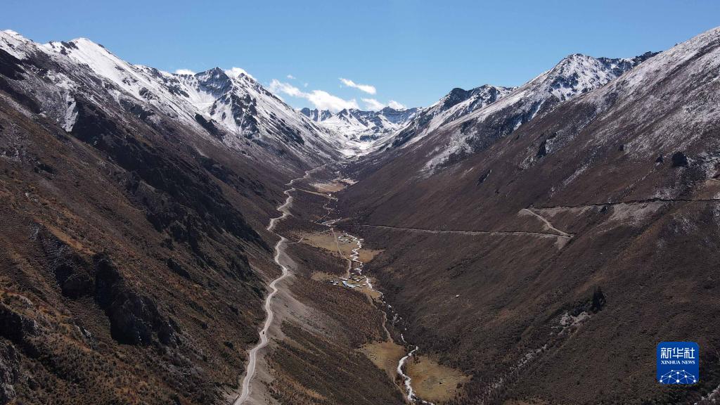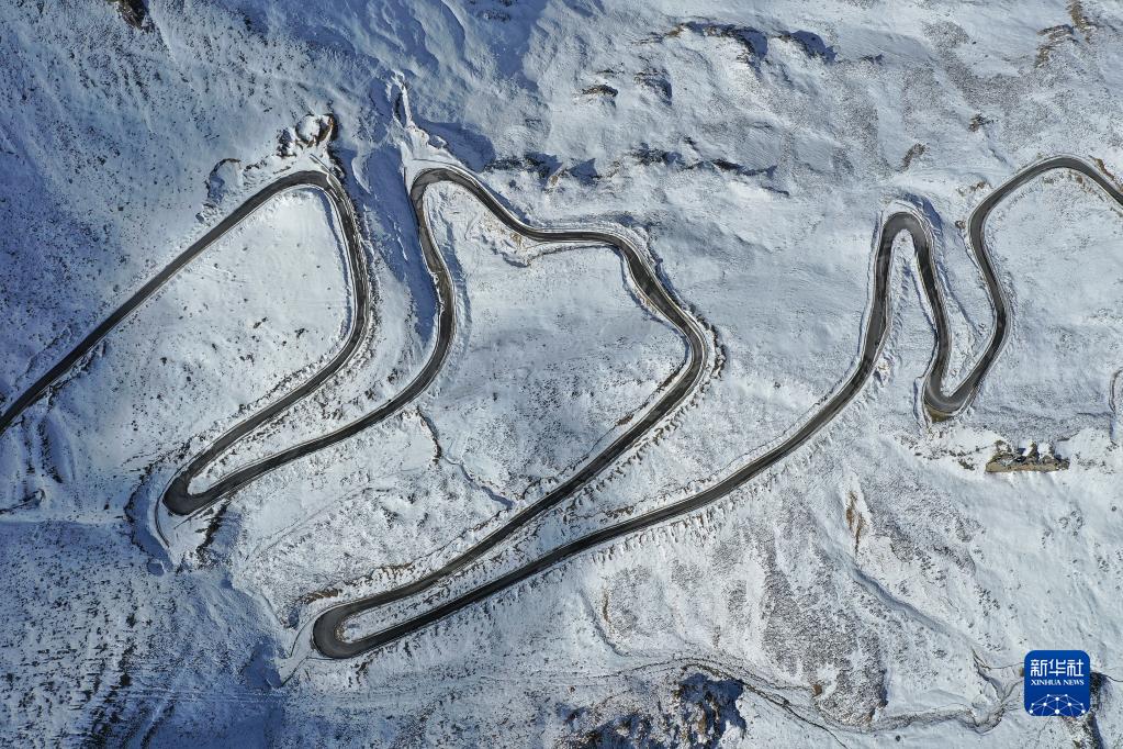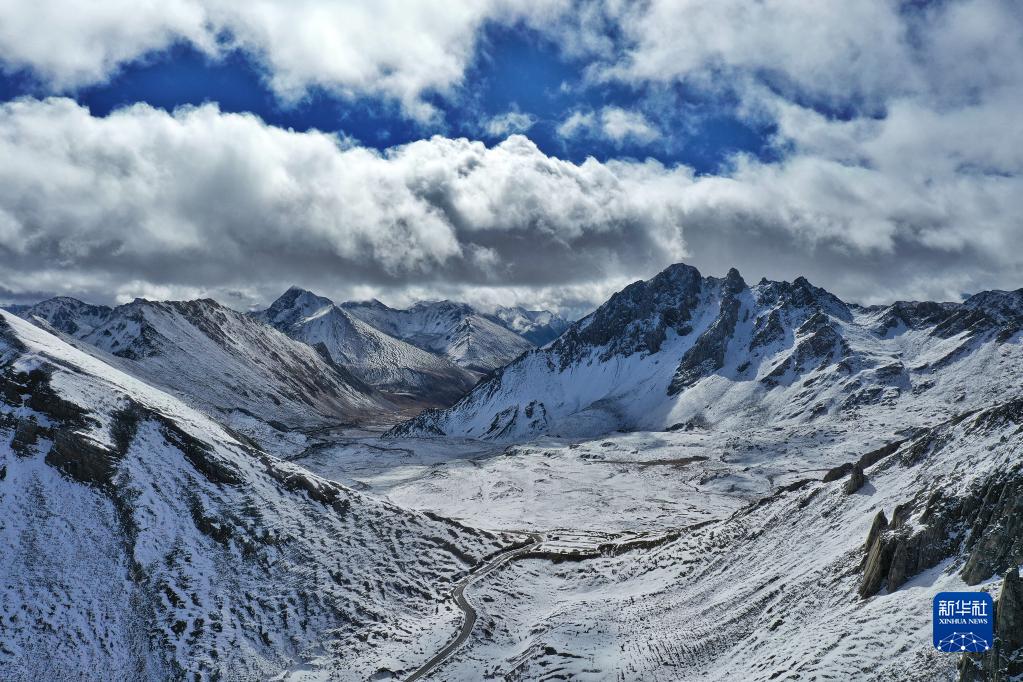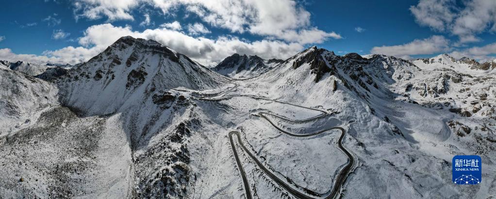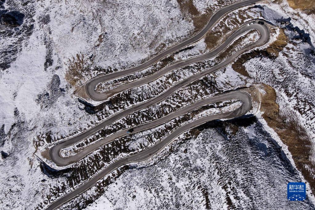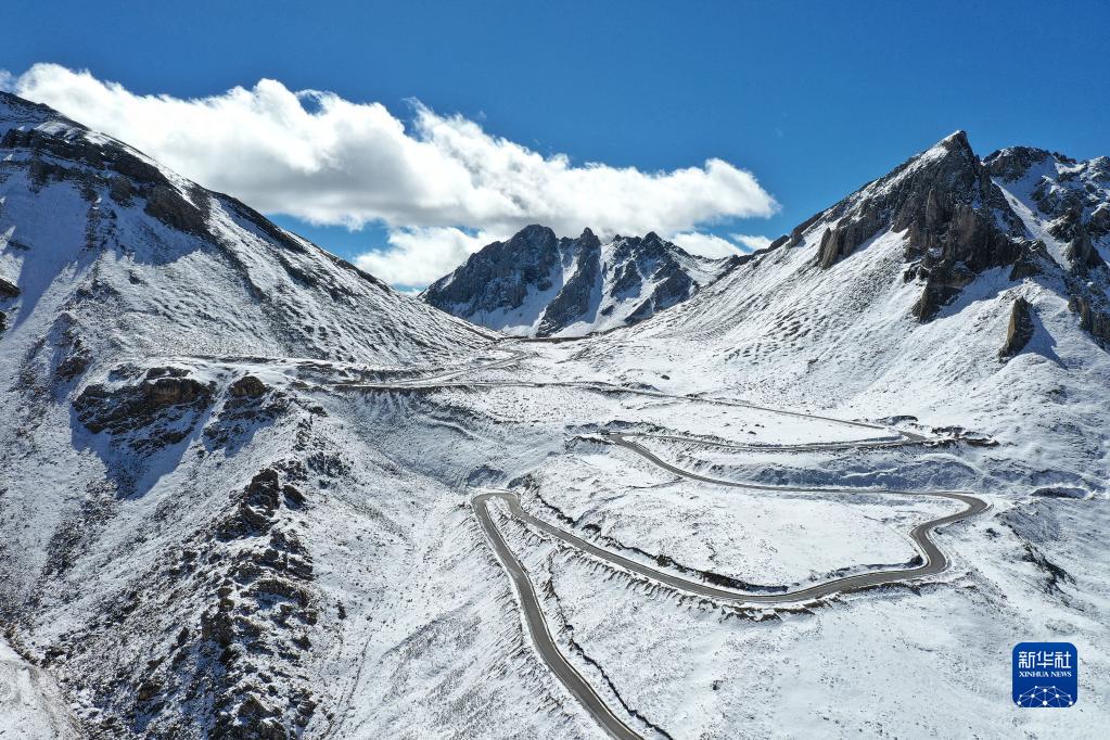 這是四川省甘孜藏族自治州巴塘縣境內的通往藏巴拉雪山埡口的公路(10月23日攝,無人機全景照片)。新華社記者 胥冰潔 攝