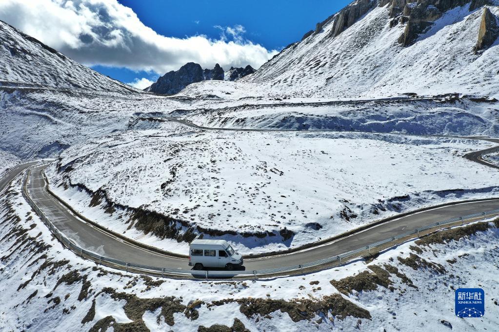 10月23日,一輛汽車行駛在四川省甘孜藏族自治州巴塘縣境內的藏巴拉雪山的公路上(無人機照片)。新華社記者 劉坤 攝