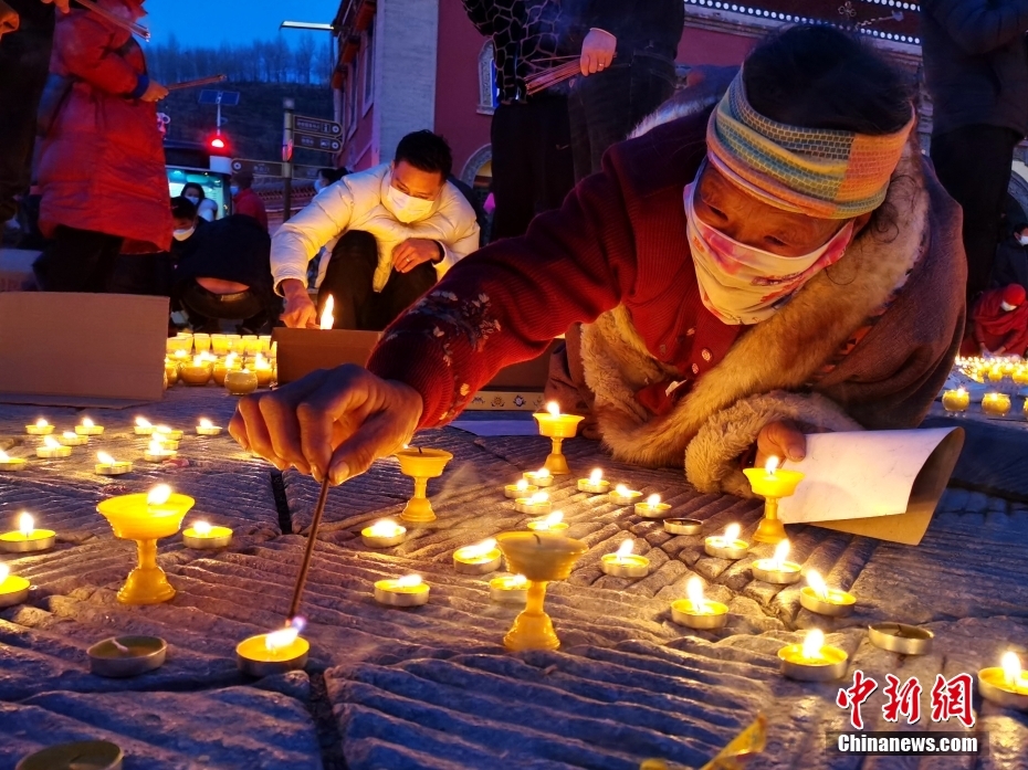 記者在塔爾寺內看到,裹著藏袍的藏傳佛教信眾,扶老攜幼,在寺院山門處的標志性建筑八寶如意塔周圍的地面燃燈,并在高原冷風中虔誠守護。