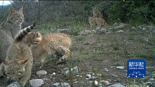 這是布設在祁連山國家公園青海片區的紅外相機拍攝到的5只荒漠貓同框畫面(2020年7月3日攝)。新華社發(祁連山國家公園青海省管理局供圖)