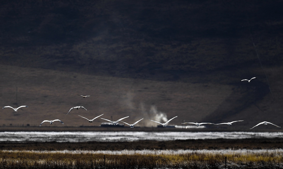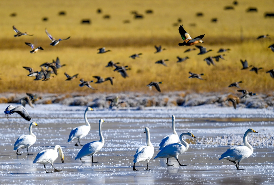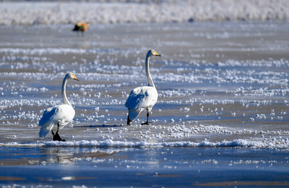 入冬以來,甘肅省甘南藏族自治州碌曲縣尕海濕地越冬的大天鵝浴雪歡歌,翩翩起舞,成為草原上一道獨特的風景。