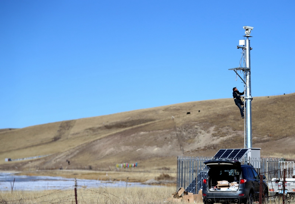 工作人員在尕海湖邊安裝遠程視頻監測監控。