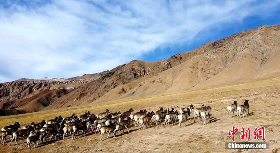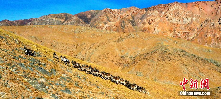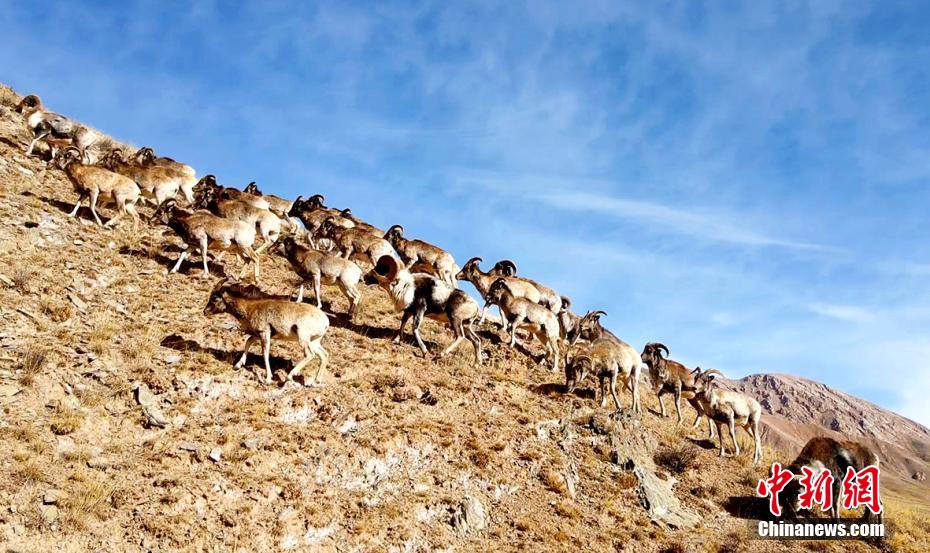 近日,攝影愛好者在地處柴達木盆地的青海省海西州都蘭縣香加鄉山區拍到成群盤羊。