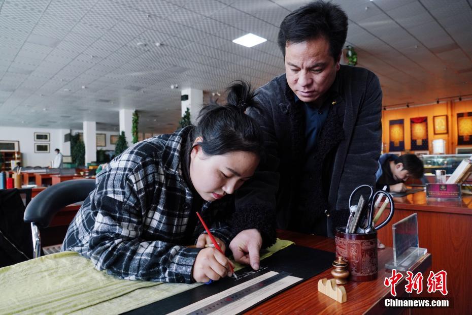 1月18日,青海省黃南藏族自治州尖扎縣非物質文化遺產綜合傳習中心負責人才讓多杰(右)向學員講解經文的書寫格式。該中心現有50名學員學習藏文書寫、唐卡繪制、藏紙手工制作技藝等。他們在學習、了解豐富多彩的藏族文化知識外,每年還可增收近5萬元人民幣。中新社記者 馬銘言 攝
