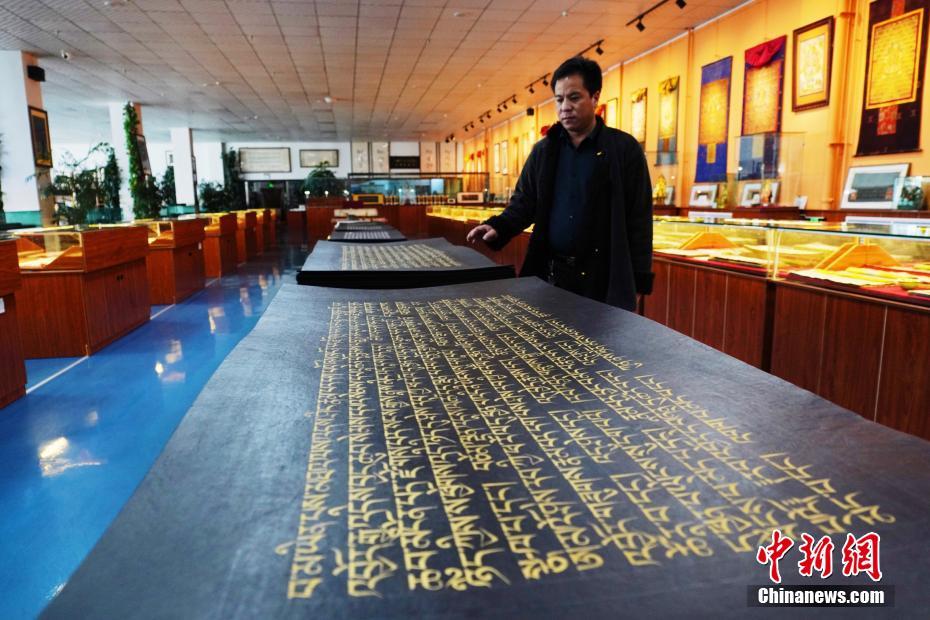 1月18日,青海省黃南藏族自治州尖扎縣非物質文化遺產綜合傳習中心負責人才讓多杰介紹即將出售的經書。該中心現有50名學員學習藏文書寫、唐卡繪制、藏紙手工制作技藝等。他們在學習、了解豐富多彩的藏族文化知識外,每年還可增收近5萬元人民幣。中新社記者 馬銘言 攝