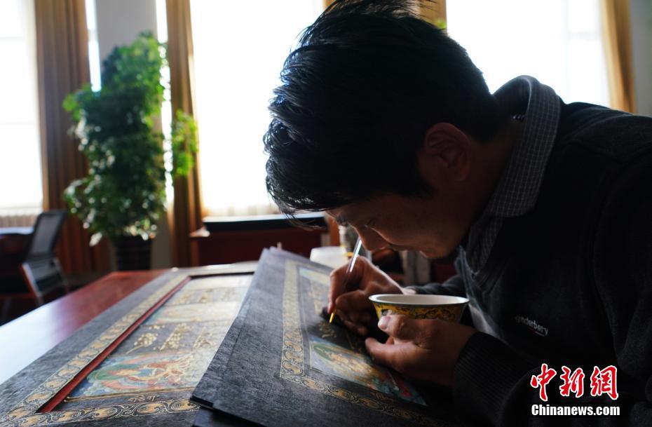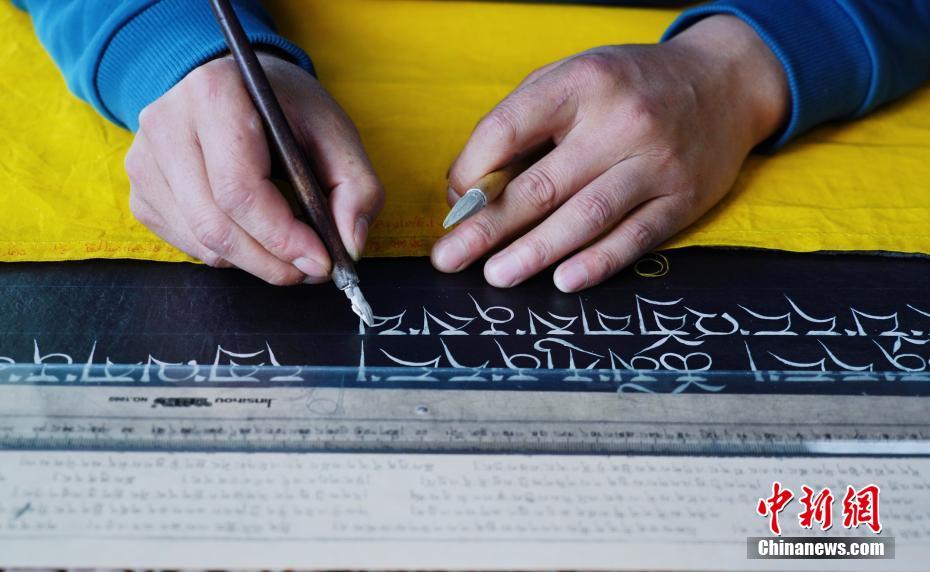 1月18日,青海省黃南藏族自治州尖扎縣非物質文化遺產綜合傳習中心內,學員正在抄寫經文。該中心現有50名學員學習藏文書寫、唐卡繪制、藏紙手工制作技藝等。他們在學習、了解豐富多彩的藏族文化知識外,每年還可增收近5萬元人民幣。中新社記者 馬銘言 攝