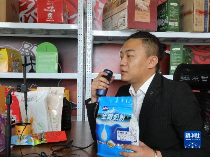 1月25日,網絡主播騰格爾在直播間為粉絲們介紹來自家鄉的農畜產品。新華社 央秀達珍 攝