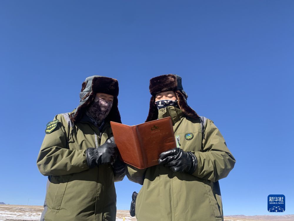2021年12月3日,祁連山國家公園沙龍灘管護站巡護隊隊長楊有財(左)在巡護監測記錄手冊上記錄。新華社 李琳海 攝