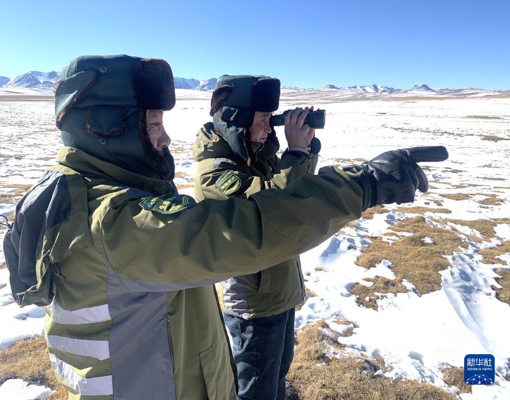 2021年12月3日,祁連山國家公園沙龍灘管護站站長祁進賢(右)在用望遠鏡觀測。新華社 李琳海 攝