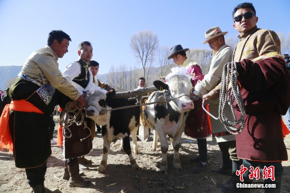 2月24日,藏族民眾用“二牛抬杠”的傳統方式開啟新春第一犁。中新社記者 馬銘言 攝