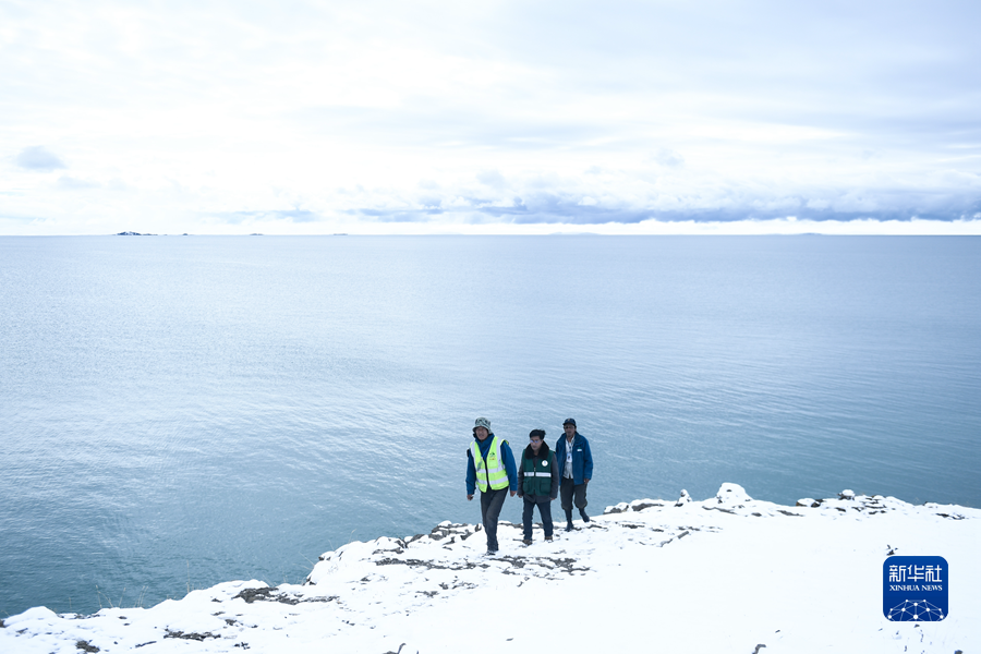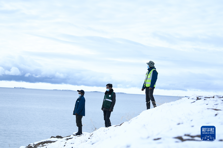 2021年10月20日,在青海省果洛藏族自治州瑪多縣扎陵湖鄉勒那村,三江源國家公園黃河源園區生態管護員在扎陵湖畔巡護。新華社記者 李占軼 攝