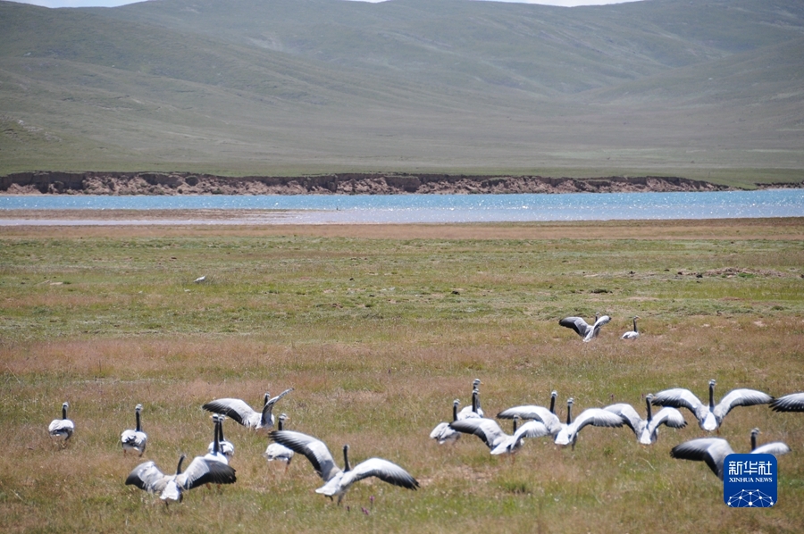 2020年8月19日,在三江源國家公園黃河源園區內,一群斑頭雁在黃河邊草地上翩然起飛。新華社記者 呂雪莉 攝