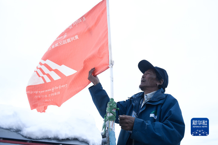 2021年10月20日,在青海省果洛藏族自治州瑪多縣扎陵湖鄉勒那村,三江源國家公園黃河源園區生態管護員安才在整理管護隊旗幟。新華社記者 張龍 攝