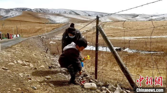 在青海省海北藏族自治州祁連縣青陽溝內,3歲的小扎西轉動著手中的風鈴,跟在母親忠可措身后開始一天的巡山。