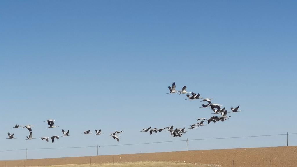 蓑羽鶴生性機警,記者所乘車輛在約百米遠處剛停下,成群的蓑羽鶴便展翅高飛,發出陣陣鳴叫,急急地向東北方向飛去。
