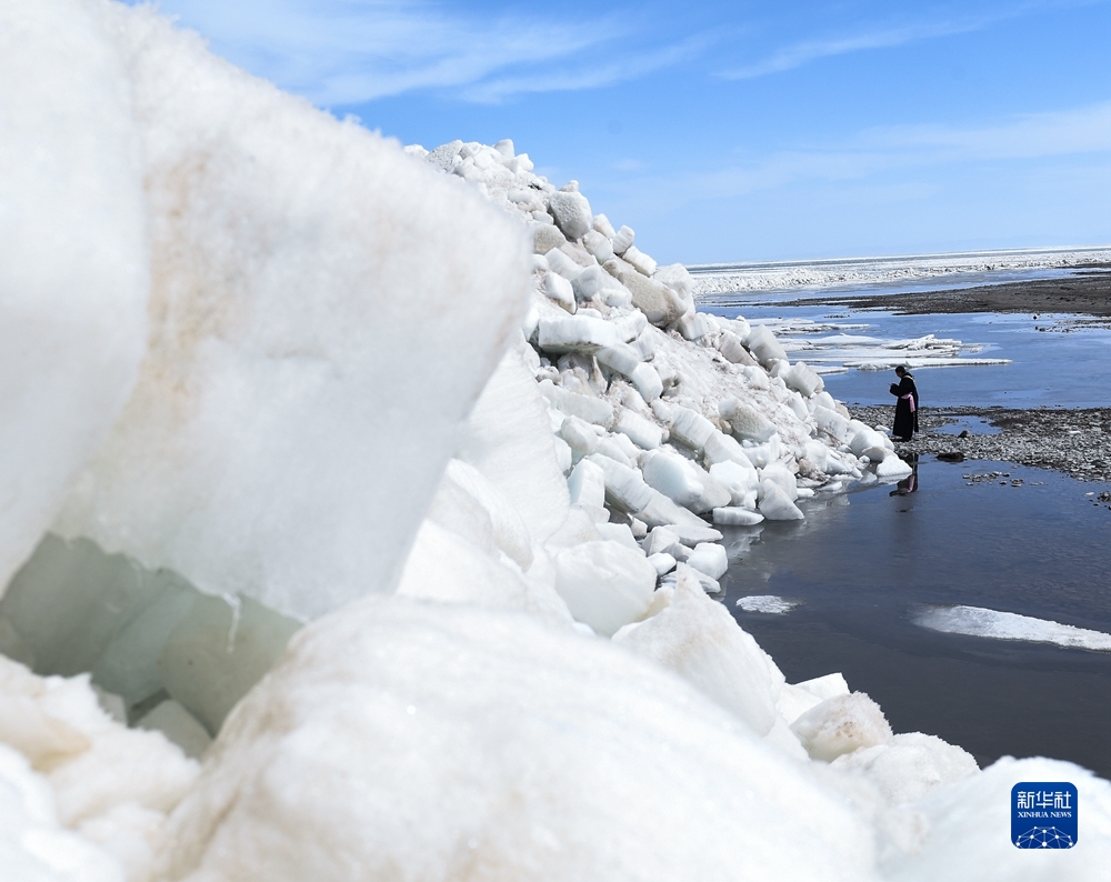 清晨,牧民才仁加站在青海湖邊遠眺,看著漂浮的冰塊散落在湖面上,像是一朵朵蓮花鑲進了藍寶石。“今年天氣好,解凍比往年更早一些,有的冰塊被湖水和風推到了岸邊,有的冰塊直接在湖里融化。”才仁加說。