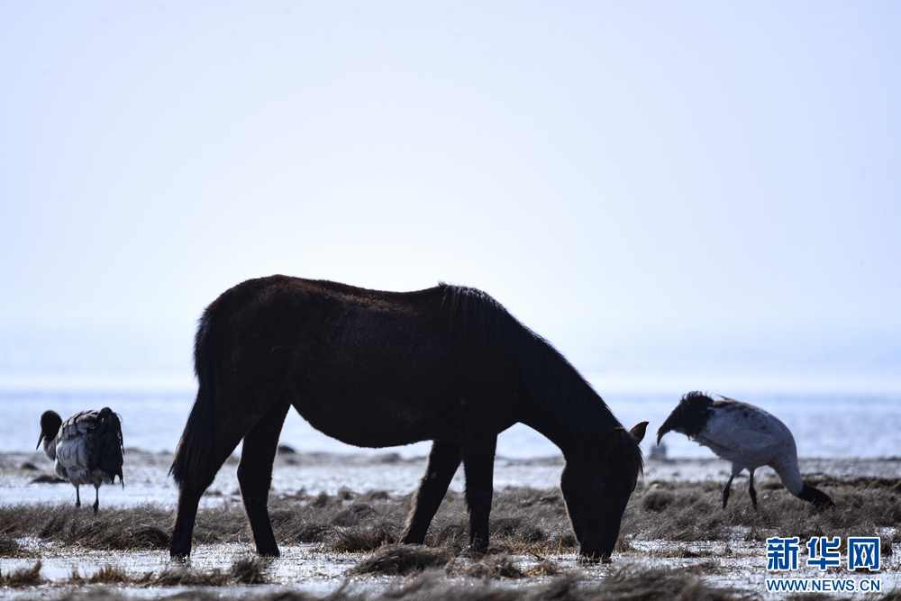 兩只黑頸鶴與一匹駿馬在青海湖畔覓食。新華網 潘彬彬 攝