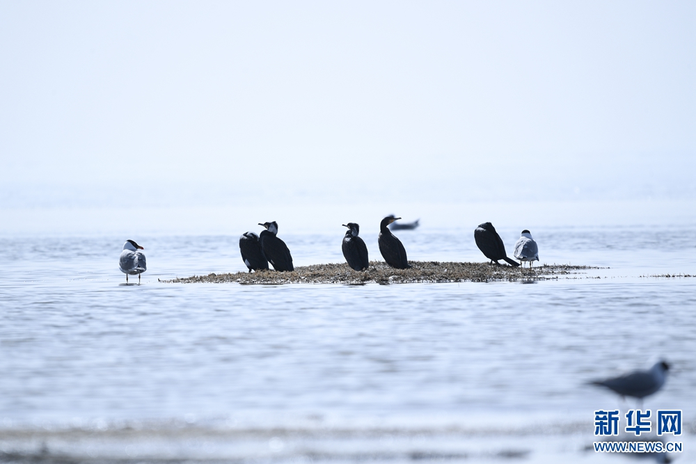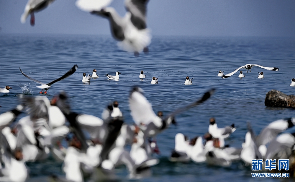水鳥在青海湖上嬉戲。新華網 潘彬彬 攝