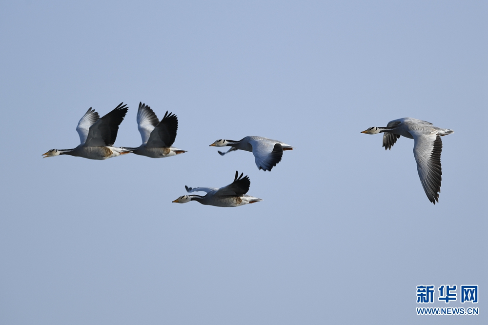 斑頭雁在青海湖上空飛過。新華網 潘彬彬 攝