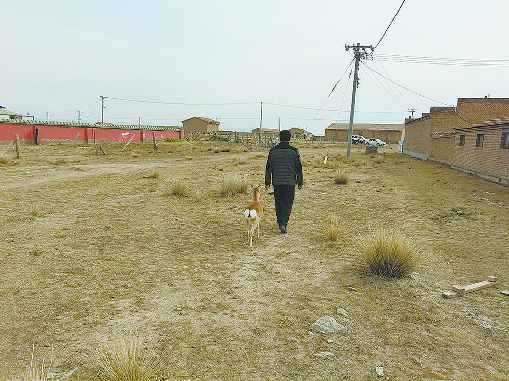 3月24日,記者第3次來到青海省海北藏族自治州剛察縣哈爾蓋鎮環倉秀麻村,拜訪一位叫周增本的牧人。找尋他的緣由,是因為他們家添了一位可愛而又特殊的“家庭成員”——一只小普氏原羚。