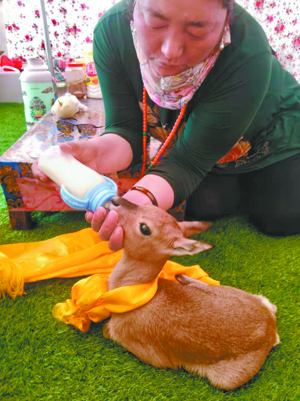 妻子扎西卓瑪始終沒有放棄喂養它,最初的3天,她每天都要花6個多小時,或跪著或趴著,把奶嘴一次次伸進“豆豆”口中,但又一次次被吐了出來。一家人整夜操心,輪流給它喂水喂奶,扎西卓瑪還在它的脖子上系了一條黃色的哈達,當做“幸運結”,希望小原羚能活下來。